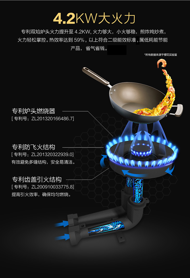 1.全新4.2KW大火力专利炉头,全铜材质,表面宜瓷龙处理,
